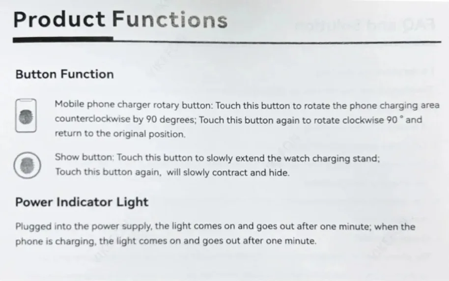 Mobile phone charger rotary button: Touch this button to rotate the phone charging areacounterclockwise by 90 degrees; Touch this button again to rotate clockwise 90° andreturn to the original position.